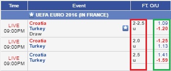 Pada gambar diatas, anda dapat melihat kolom bertanda warna MERAH yang menampilkan kurs untuk O/U yaitu 2-2.5, 2.0 dan 2.5.