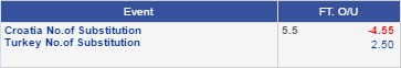 Total substitutions adalah permainan menebak over under (OU) pergantian pemain kedua tim. 1tim hanya bisa mengganti pemain sebanyak 3kali , berarti di total 2 tim adalah 6kali pergantian (masing masing 3 kali).
